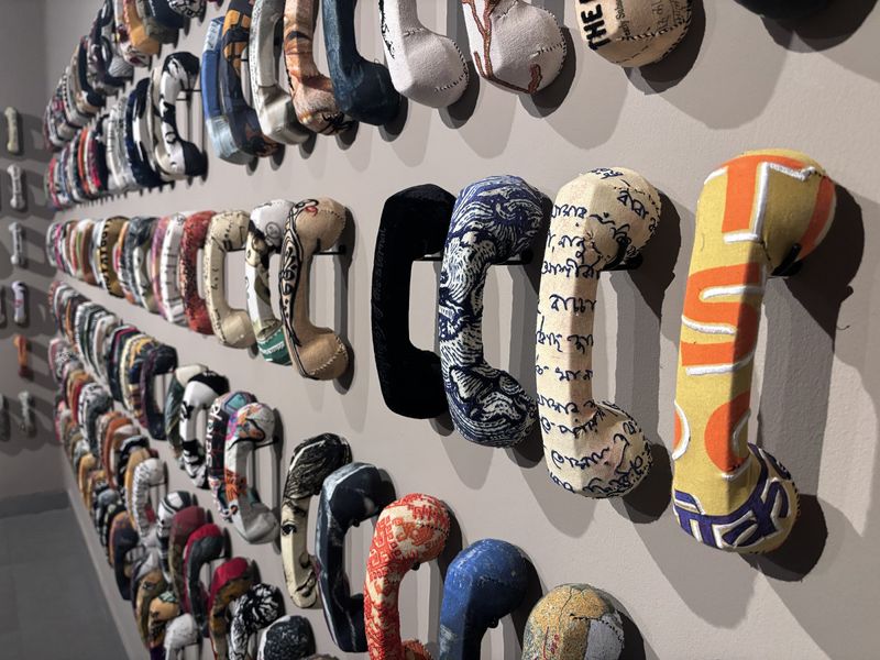 The phone calls did shape his earliest days in the city. One finds them in the installation titled ‘Countless Conversations’, featuring 365 hand receivers of the dial-phones of that era, covered with embroidered/painted textile, each conveying a telltale story – through lines from correspondence, poems, film posters, and newspaper clippings, among others. Telephonic conversations then could only hold the temporality of sound in real time, which vanished when the call ended. What remained were memories – of voices one loved or longed to hear, or quotidian concerns that made up the business of life.