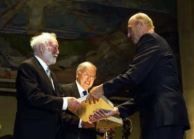 Michael Atiyah (centre) and I.M. Singer (left) receiving the Abel Prize in 2004 courtesy Scanpix/The Norwegian Academy of Sciences and Letters