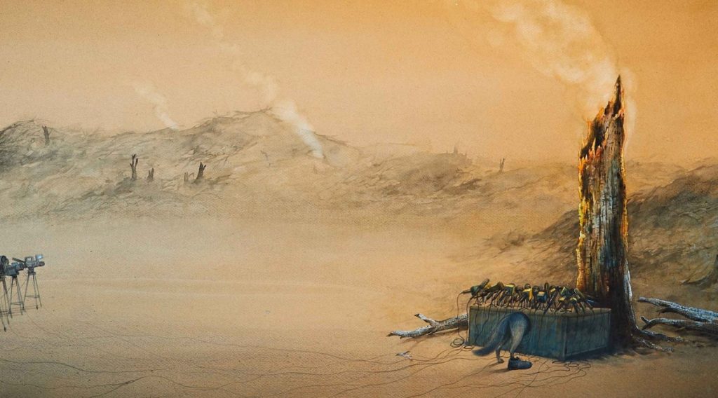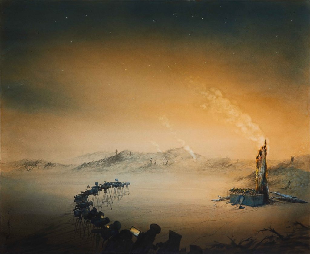 In the 27 feet long and almost eight feet tall dystopian sweep of 'Plantation', we come across a group of pack-mules pulling a six-axle cart, with two of them plodding along in industrial gumboots. A similar instance can be noticed in 'Press Conference', where a bevy of cameras are focused on a fox disappearing into a hole as the last tree burns to the ground, sending clouds of smoke.