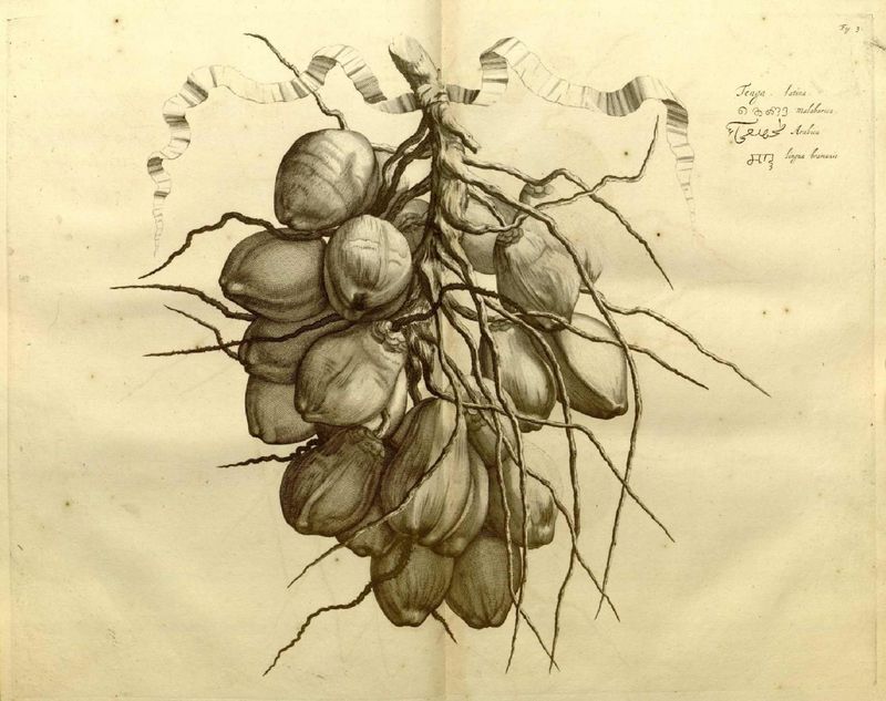 An illustration of the coconut tree from Hortus Malabaricus, with names in Latin, Malayalam, Arabic and Konkani written in the Nagari script. Credit: K.S. Manilal