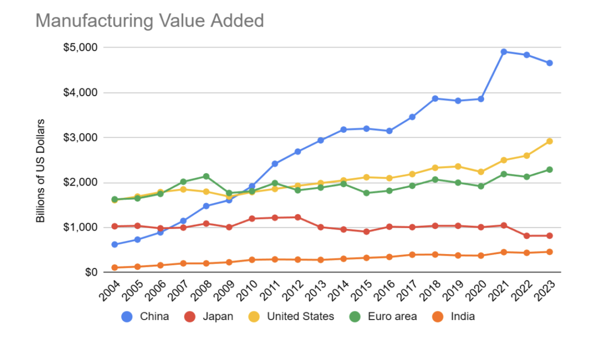 | Country | 2023 Manufacturing Value Added (trillions of US Dollars) | Share of World Manufacturing Value Added |