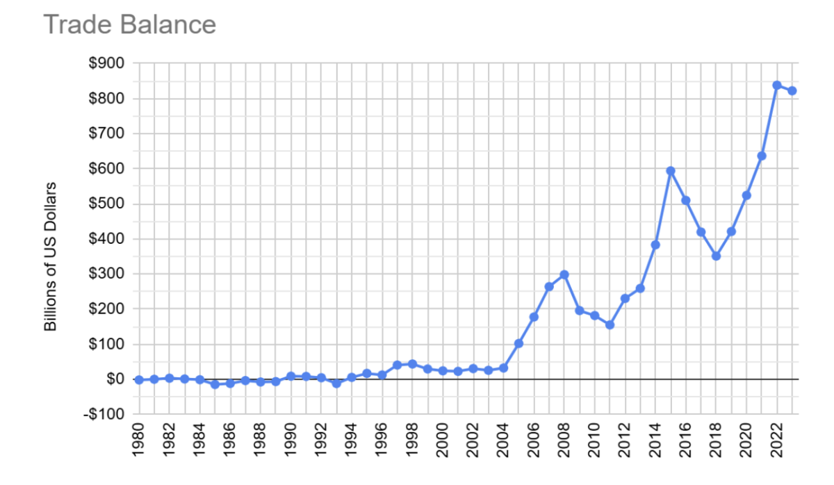 This manufacturing prowess is clearly reflected in export performance. After China joined the World Trade Organization (WTO) in December 2001, its trade balance with the rest of the world grew from $30 billion in 2002 to an astonishing $838 billion by 2022. The balance for 2024, reported by China’s General Administration of Customs, is even higher, at $983 billion.