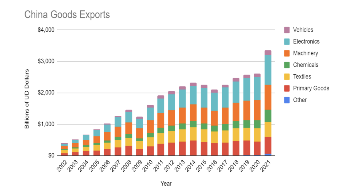 Alongside this spectacular growth in total exports relative to imports, the mix of China’s exports has changed substantially. In 2002, textiles constituted 26% of China’s exports. By 2021 the share of textiles had fallen to 14%. In contrast, the share of Chemicals, Machinery, Electronics, and Vehicles taken together has risen from 54% to 68% over the same period. This transition to more sophisticated manufacturing has been a feature of the east asian economic development paradigm: Japan, South Korea, and Taiwan have had very similar trajectories before.