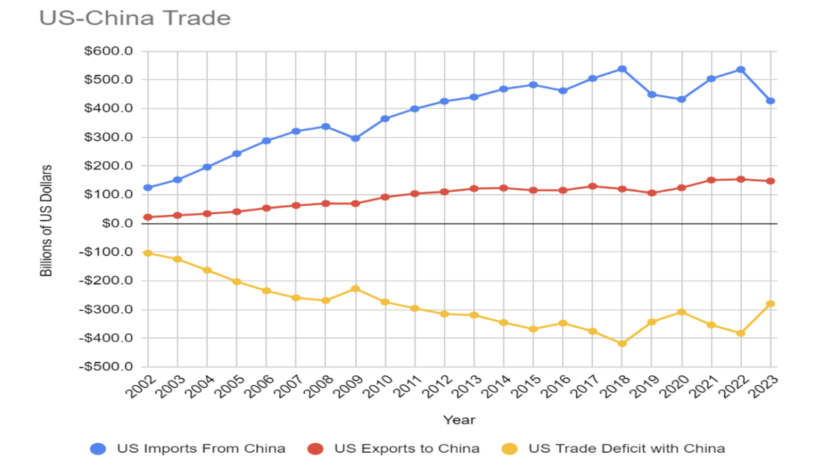In 2018, the Trump administration initiated a trade war, with Trump claiming that "trade wars are good, and easy to win". In August 2019, China was labeled a “currency manipulator’’ by the US Treasury. Although the designation was reversed in January 2020 following negotiations, the trade tariffs were not lifted. The Biden administration continued the tariff policy. As a consequence of the initiation of the trade war, US imports from China did see a two-year decline after 2018, but rose again in the aftermath of the Covid-19 pandemic, before falling in 2023.