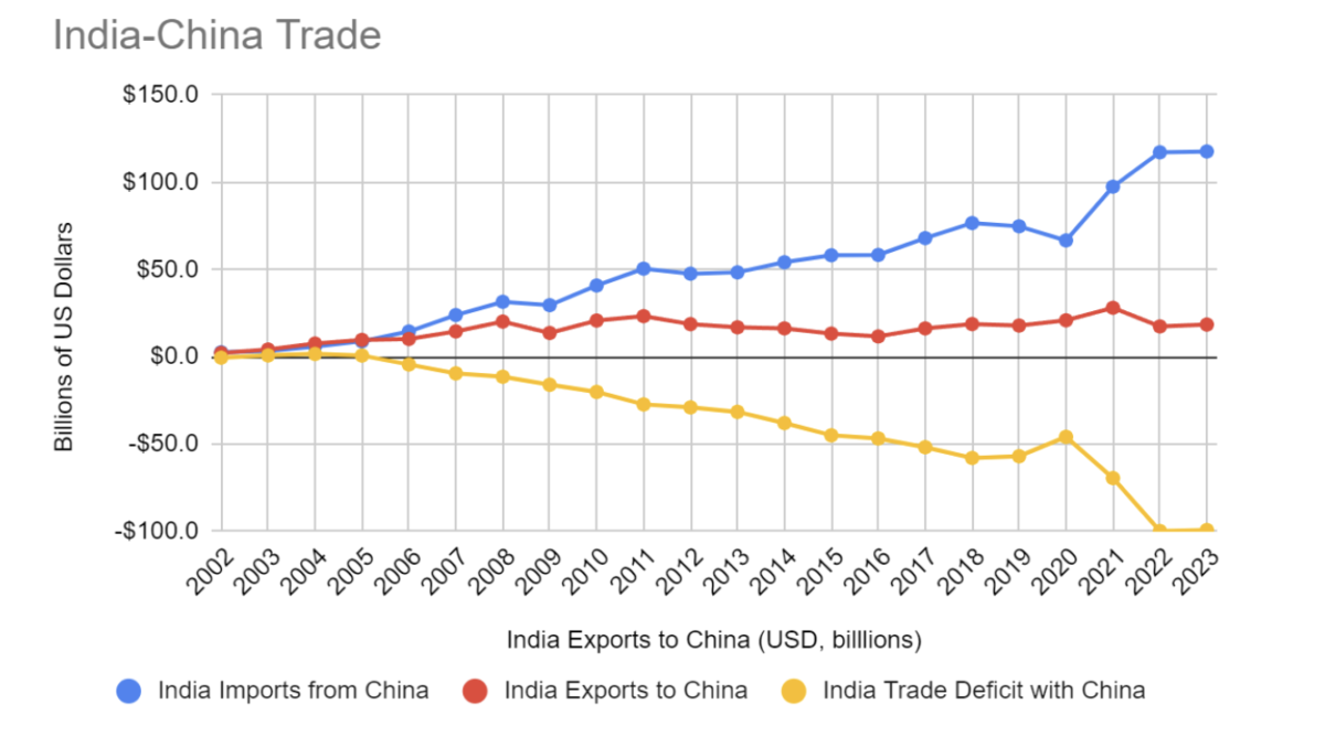 What about India? Despite the territorial disputes and border clashes over the last few years, India’s imports from China have more than doubled, from $48 billion in 2013 to $117 billion in 2023. Exports to China, on the other hand, have hovered around $18 billion (though 2021 was an exception, with $28 billion in exports). This has resulted in India’s trade deficit with China ballooning to nearly $100 billion in 2023.
