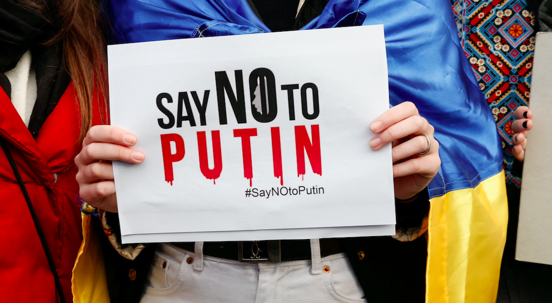 A person carries a sign outside Russia's embassy during a protest against a potential war in Ukraine, in Paris, France, February 22, 2022. Photo: Reuters/Benoit Tessier