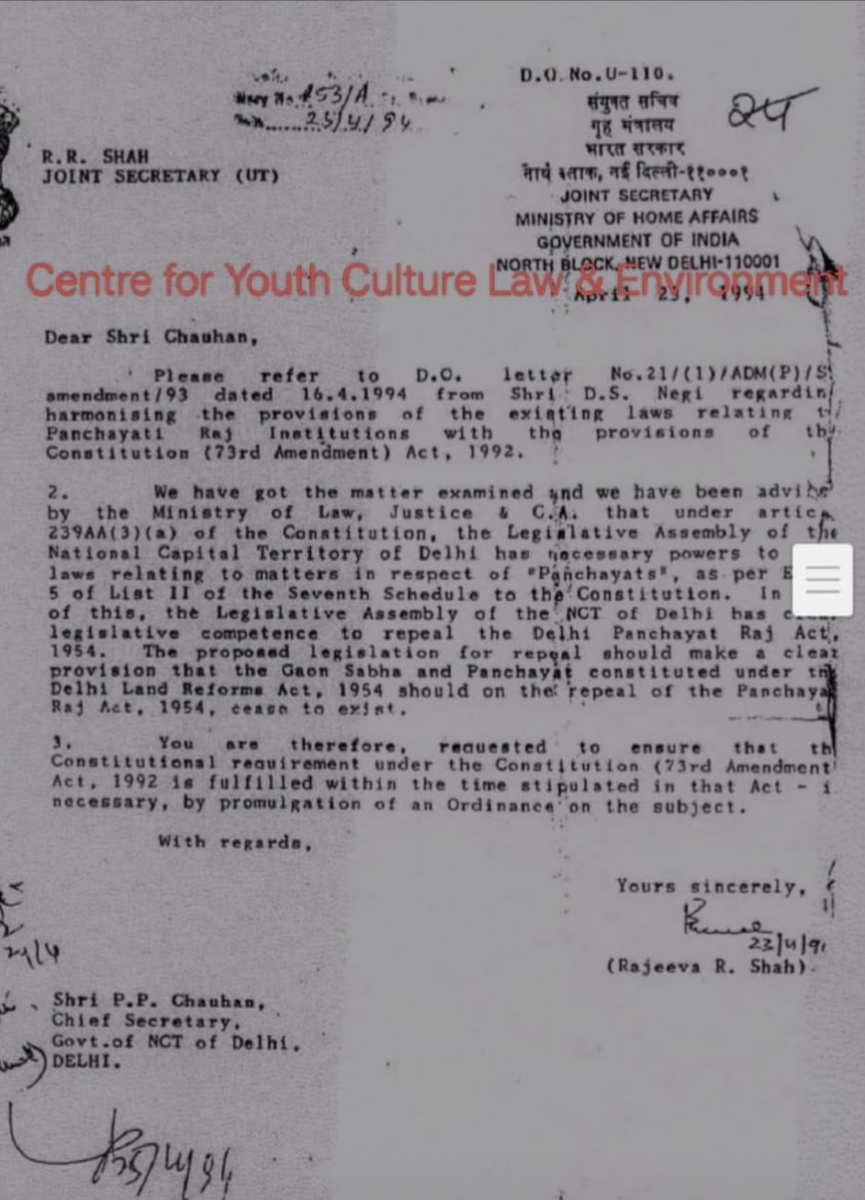 The constitution mandated that every village in India should be governed by its own panchayat. Delhi was no exception. The MHA, which directly controls Delhi’s governance framework, had the duty to align the Delhi Land Reforms Act, 1954, and Delhi Panchayati Raj Act, 1954, with the 73rd Amendment.