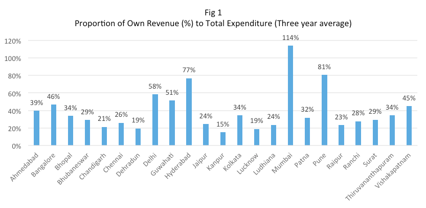 Cities need significant amounts of capital to invest in not just creating new infrastructure and catching up on service delivery deficits, but also for revenue expenditure such as operations and maintenance and hiring of talent. The High-Powered Expert Committee 2011 report estimated India’s urban infrastructure expenditure requirement is at Rs 39.2 lakh crores. Our study revealed that India’s cities fare poorly on two counts related to finances – generation of revenue, management of the resources they generate.