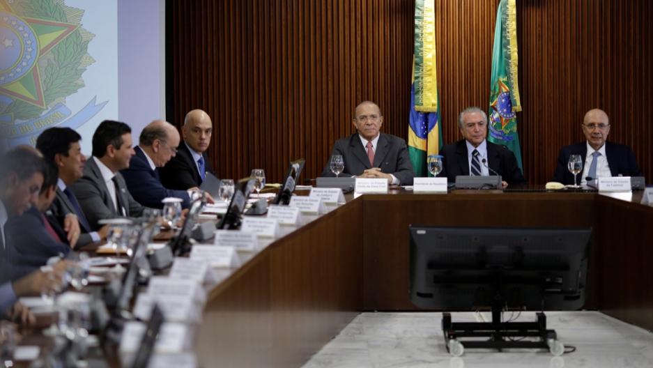 Brazil's Chief of Staff Eliseu Padilha, interim President Michel Temer, Finance Minister Henrique Meirelles are seen during the first ministerial meeting at the Planalto Palace in Brasilia, Brazil, May 13, 2016. Credit: Ueslei Marcelino/Reuters