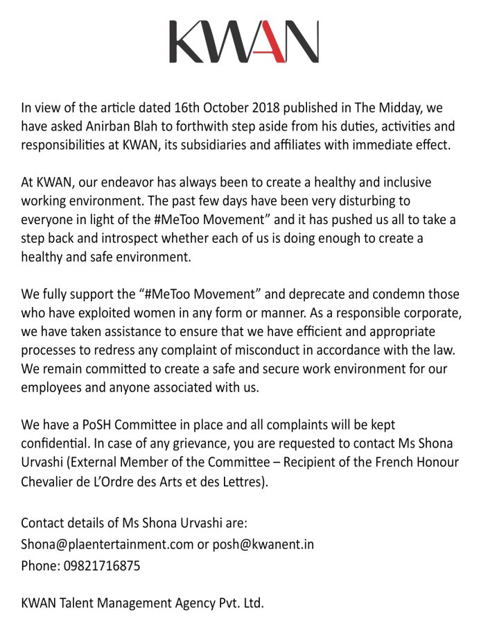 TATA motors has also sent its corporation head Suresh Rangarajan on leave to conduct an inquiry into allegations of sexual harassment made against him. Likewise, KWAN Talent Management Agency Pvt. Ltd. has asked Anirban Das Blah to step aside from all his duties. Ajit Thakur, head of content studio of Entertainment and Media business of Reliance Industries has resigned. Impressario entertainment has set up a women-only inquiry committee to investigate allegations made against its event manager Vibhu Sharma.