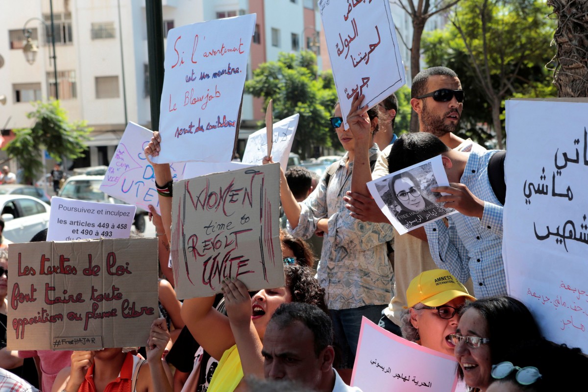 Moroccan activists hold signs in solidarity with the journalist charged with fornication and abortion, during a protest outside the Rabat tribunal, Morocco September 9, 2019. Photo: Reuters/Youssef Boudlal