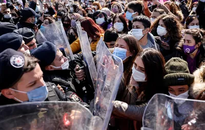 A heavy police presence was seen in Turkey's largest city as protesters demanded thatPresident Recep Tayyip Erdogan overturn a policy that affects women and LGBTQ communities.