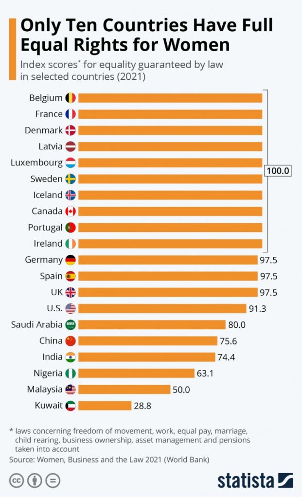There are only ten countries in the world which offer full legal protections to women, according to the report Women, Business and the Law 2021, recently published by the World Bank. Belgium, France, Denmark, Latvia, Luxembourg, Sweden, Canada, Iceland, Portugal and Ireland were the only ones offering full equal rights for men and women, at least from a legal perspective. Ninety-four countries out of the world’s 194 ranked at 80% or above, up from 87 in 2020. Saudi Arabia, which came in last in 2019, has improved its score majorly following new laws implemented in the country and now ranks 91st at 80%. The last place in the 2020 ranking went to Yemen (26.9%), ahead of Kuwait (28.8%) and Sudan (29.4%).