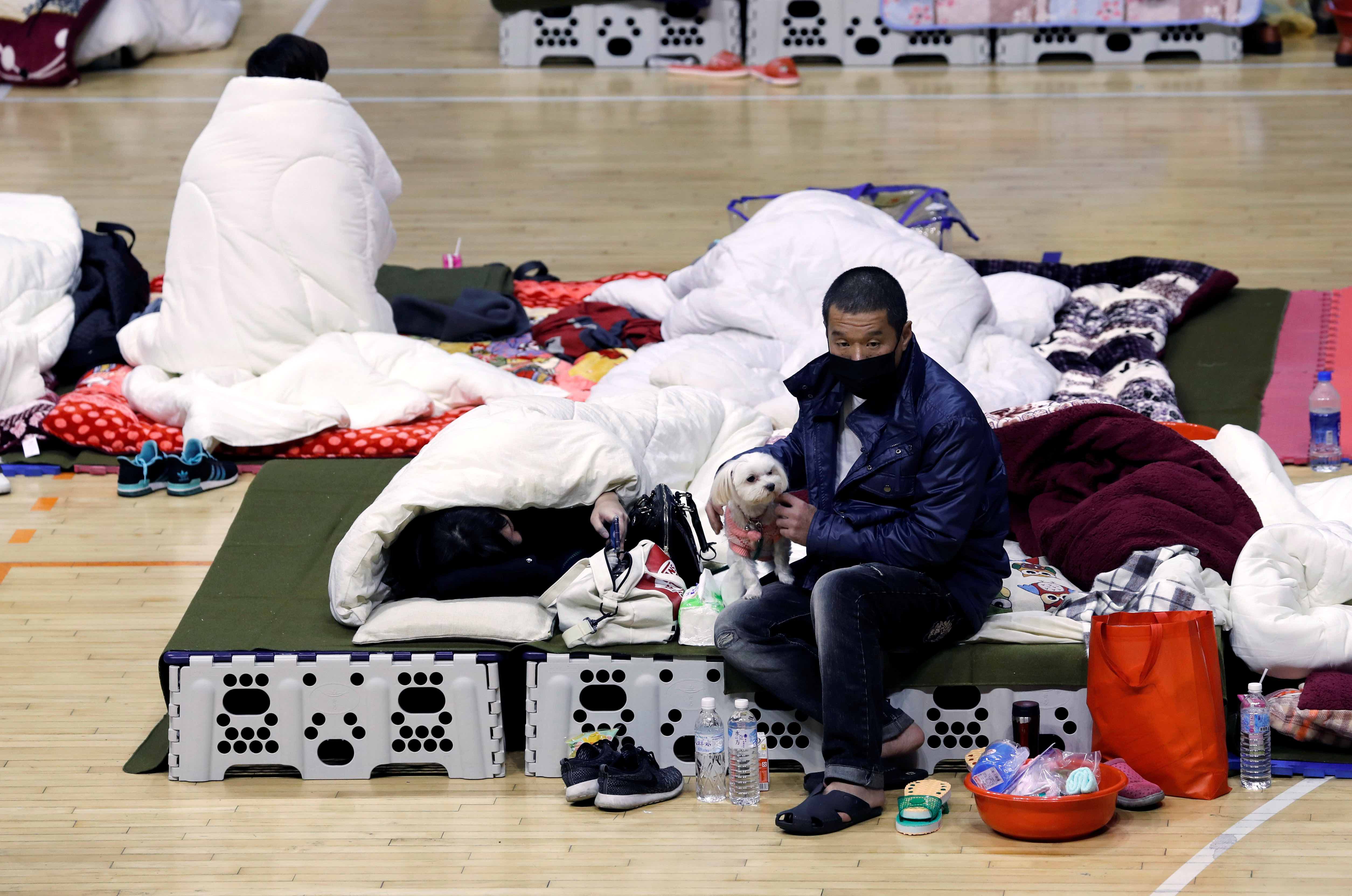 A resident takes shelter with his pet dog at a local stadium after an earthquake in Hualien, Taiwan February 7, 2018. Credit: Reuters/Tyrone Siu
