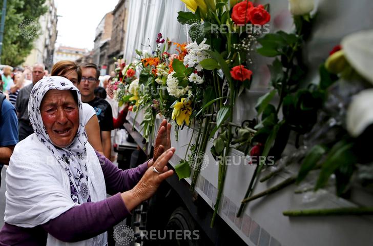 A woman cries beside a truck carrying 136 coffins of newly identified victims of the 1995 Srebrenica massacre, in front of the presidential building in Sarajevo July 9, 2015. Credit: Reuters