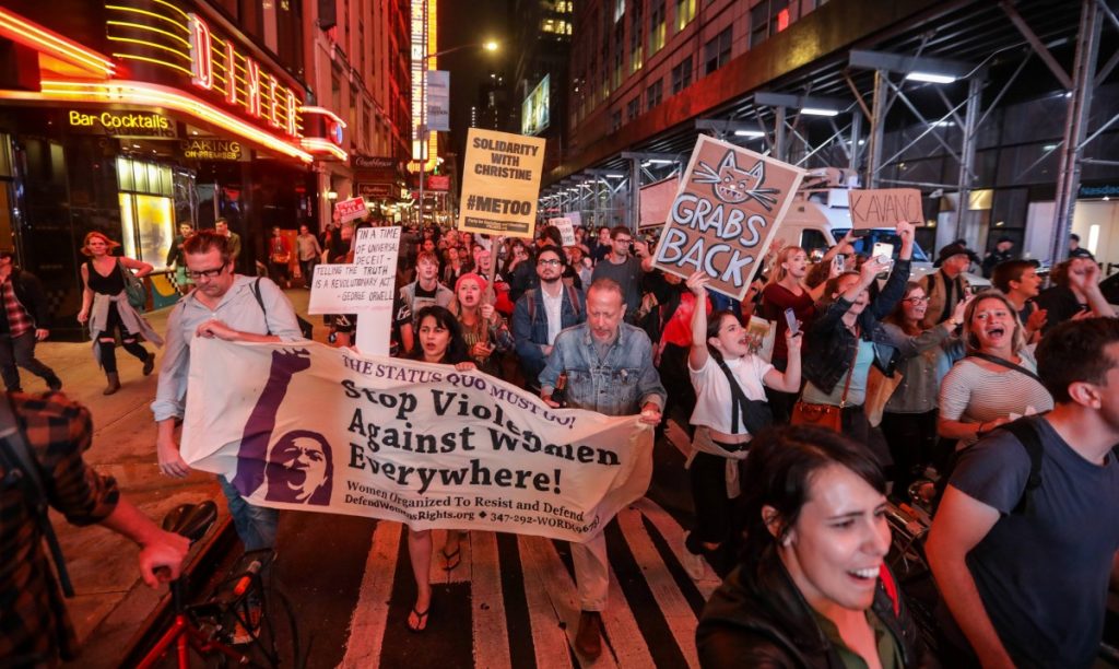 Activists march in opposition to US Supreme Court nominee Brett Kavanaugh and in support for Christine Blasey Ford, the university professor who has accused Kavanaugh of sexual assault in 1982, near Times Square in New York City, New York, US, October 6, 2018. Credit: Reuters/Stephen Yang