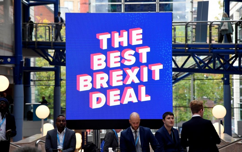 Delegates walk near an electronic billboard displaying a political slogan during the Conservative Party Conference in Birmingham, Britain, October 1, 2018. Credit: Reuters/Toby Melville