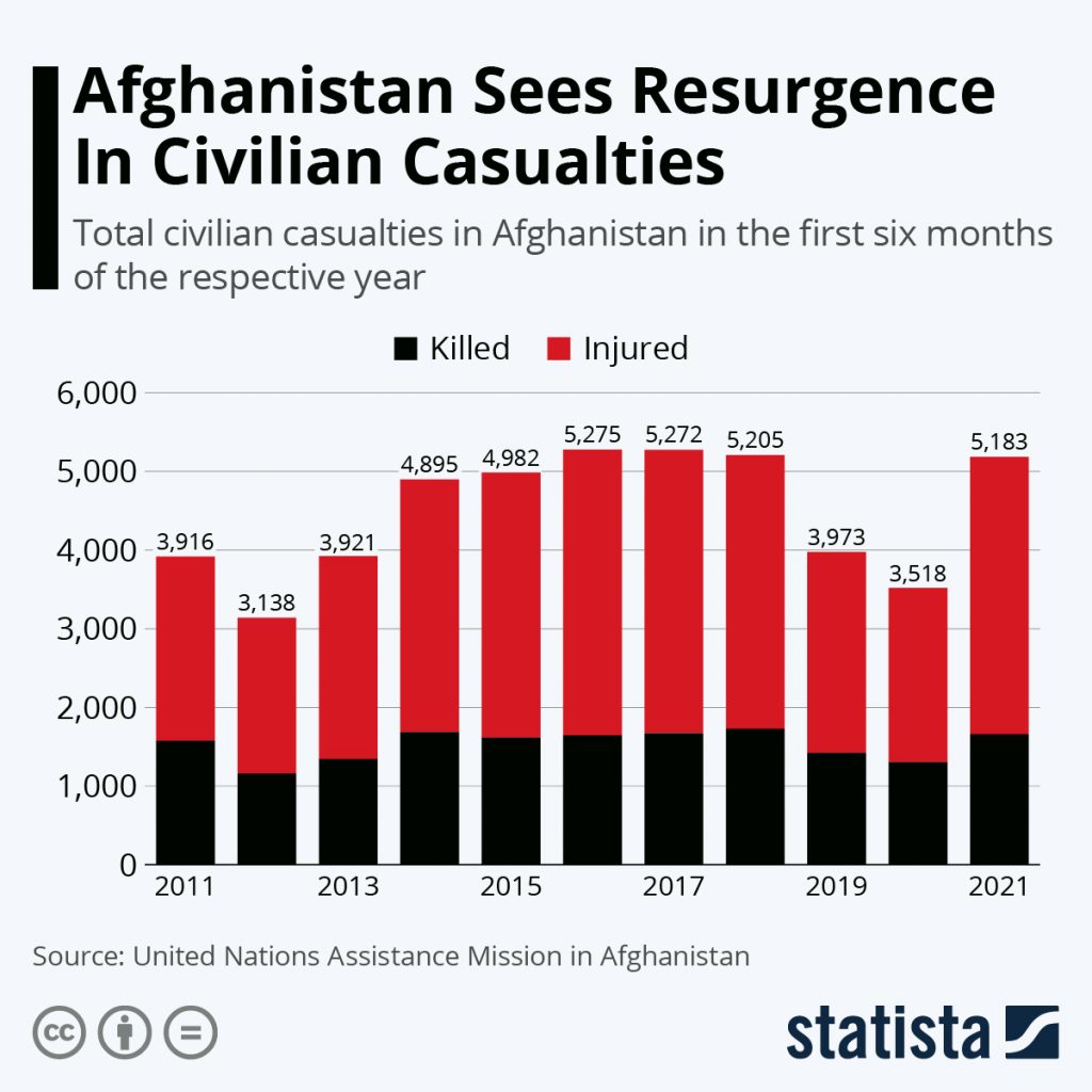 Data from the United Nations Assistance Mission in Afghanistan shows that the country experienced a resurgence in civilian deaths in the first six months of 2021. The toll has been particularly severe since the beginning of May when international forces commenced their final withdrawal at the same time as the Taliban launched a major offensive.