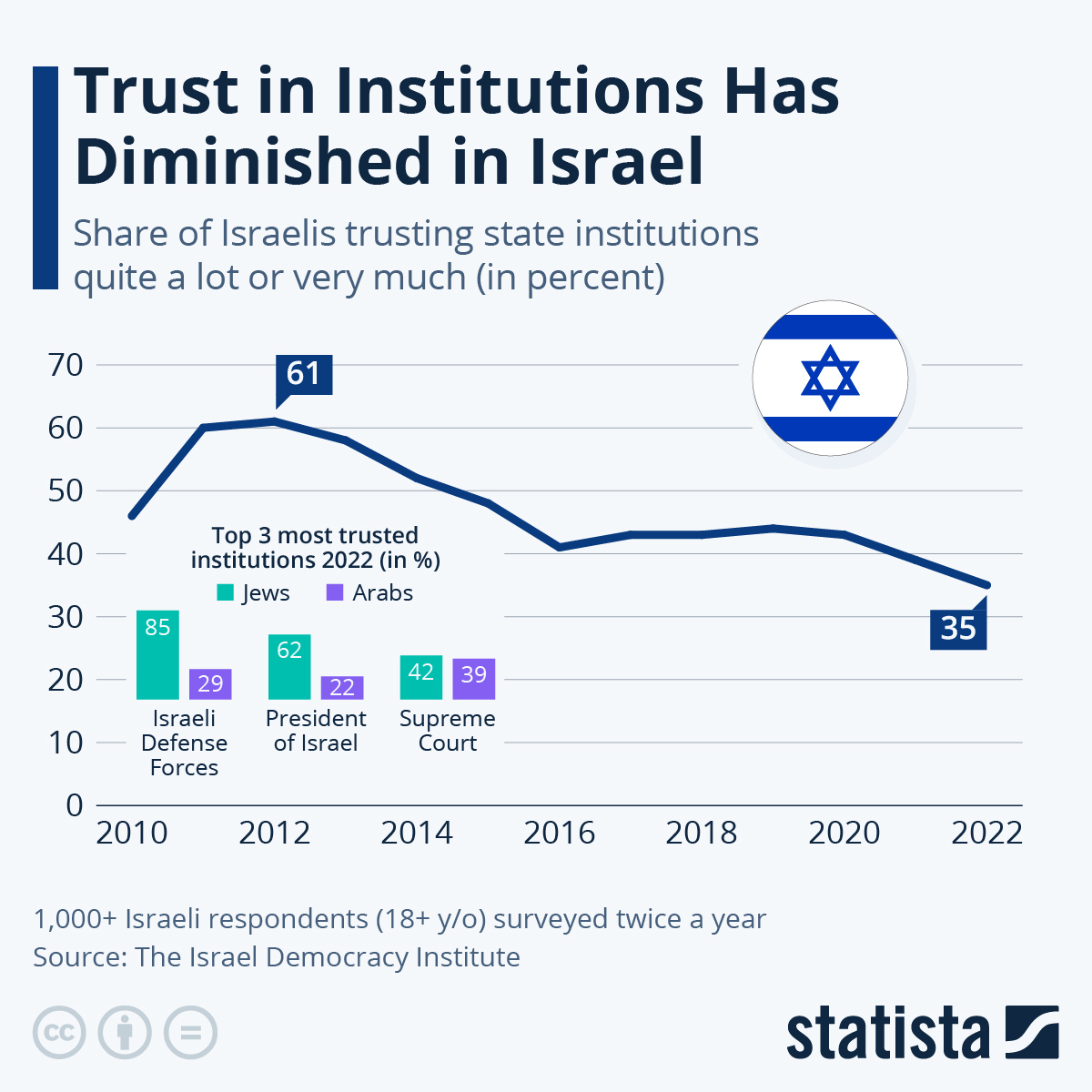 As seen in an annual survey by The Israel Democracy Institute, Israelis’ trust in the state’s institutions has been deteriorating for some years, with only 35% of people in the country saying they trusted institutions quite a lot or very much in 2022, down from a high of 61% in 2012. The Supreme Court still enjoyed a comparably high trust score: 42% of Jewish Israelis said they trusted it last year – rank 3 behind the Israeli Defense Forces and the President of Israel. This score was substantially higher than trust in the government (24%) and the Knesset, the Israeli parliament (19%). For Arab Israelis in the survey representative of the country’s population, the Supreme Court was the most trusted institution out of all, while trust was lower across the board for this group.