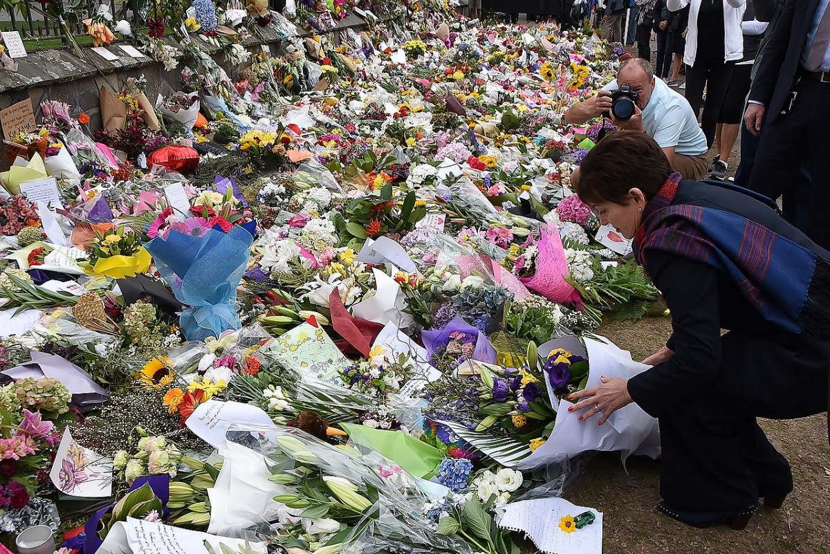 People lay flowers at Christchurch Botanic Gardens for those killed in mosque attacks. Photo: Wikimedia Commons/Government House, New Zealand/CC BY-SA 4.0 DEED