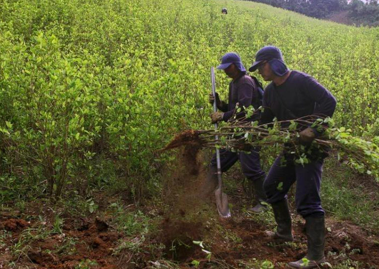 Workers hired by the Colombian government destroy coca plants during an eradication operation at a plantation in Yali, northeastern Antioquia in 2014. Photo: Reuters/Fredy Builes