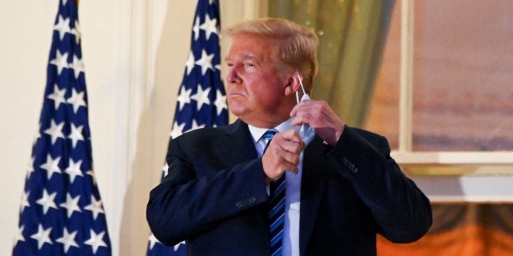 US President Donald Trump pulls off his face mask as he poses atop the Truman Balcony of the White House after returning from being hospitalised at Walter Reed Medical Center for COVID-19 treatment, in Washington, US, October 5, 2020. Photo: REUTERS/Erin Scott