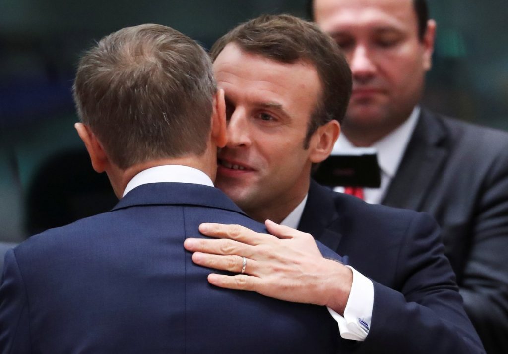 French President Emmanuel Macron and European Council President Donald Tusk hug as they take part in an extraordinary EU leaders summit to finalise and formalise the Brexit agreement in Brussels, Belgium November 25, 2018. Credit: Reuters/Yves Herman