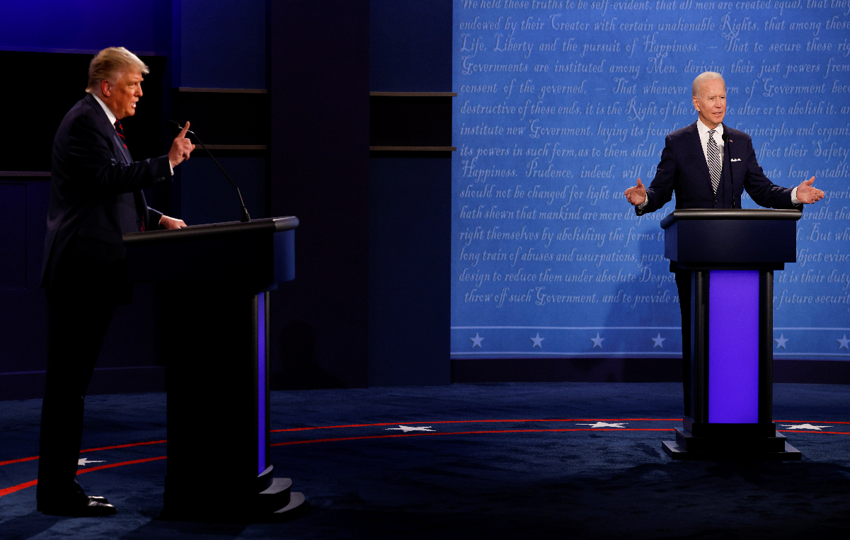 US President Donald Trump and Democratic presidential nominee Joe Biden participate in their first 2020 presidential campaign debate held on the campus of the Cleveland Clinic at Case Western Reserve University in Cleveland, Ohio, US, September 29, 2020. Reuters/Brian Snyder