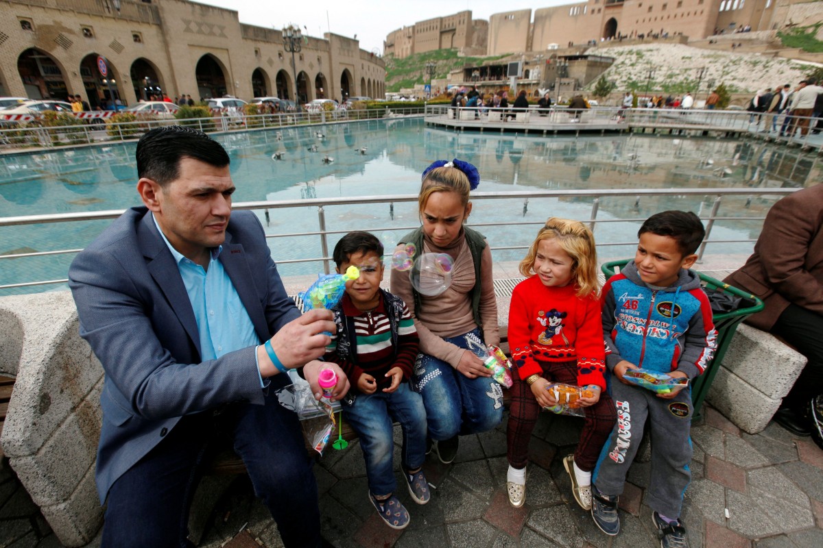 Abdullah Ghaleb Kurdi, the father of the drowned Syrian toddler Aylan Kurdi whose dead body was found washed up on a Turkish beach in 2015, distributes gifts to children in Erbil, Iraq February 28, 2020. Photo: Reuters/Azad Lashkari