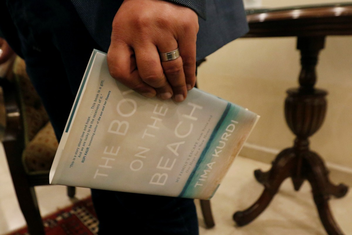 Abdullah Ghaleb Kurdi carries "The boy on the beach" book written about his son, Alan Kurdi, whose dead body was found washed up on a Turkish beach in 2015, during an interview with Reuters in Erbil, Iraq February 27, 2020. Photo: Reuters/Azad Lashkari