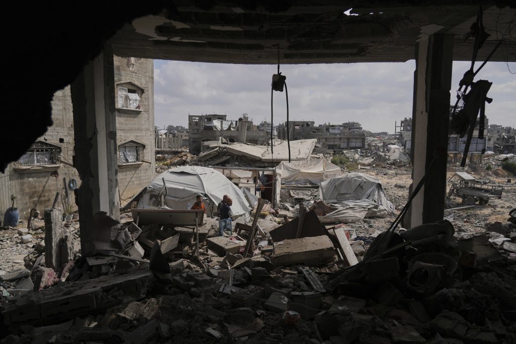 Palestinians look at the damage after an Israeli army airstrike in Beit Lahia, northern Gaza Strip, Monday, April 28, 2025. Photo: AP/PTI.