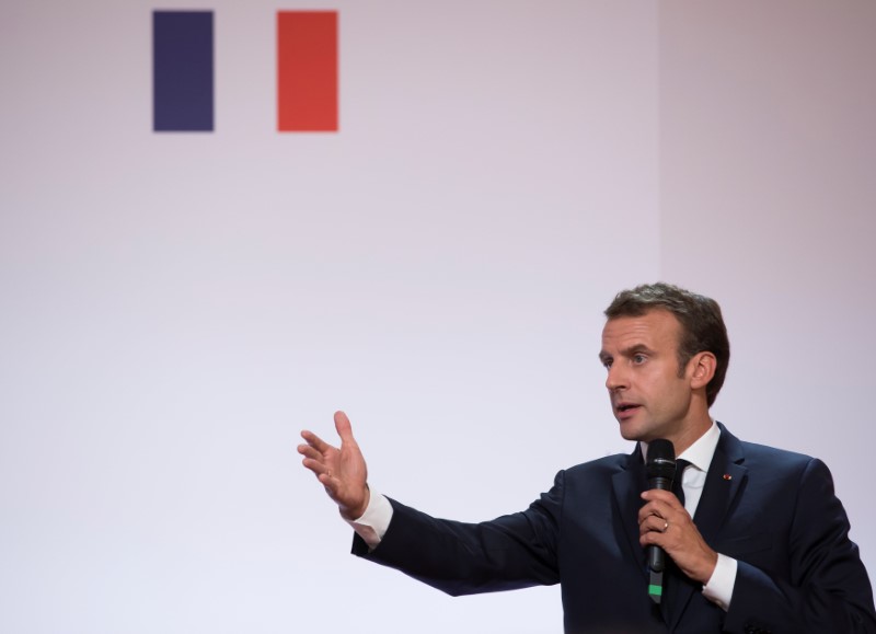 French President Emmanuel Macron delivers the closing speech during the "Les Entreprises S'engagent" ("Companies are committing", or "Companies get involved") forum held at the Elysee Palace in Paris, France July 17, 2018. Credit: Ian Langsdon/Pool via Reuters