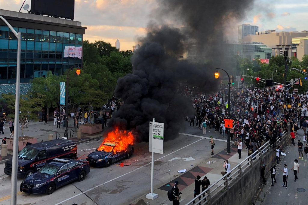 An Atlanta Police car burns as people protest against the death in Minneapolis police custody of African-American man George Floyd, near CNN Center in Atlanta, Georgia, US May 29, 2020. Photo: REUTERS/Dustin Chambers