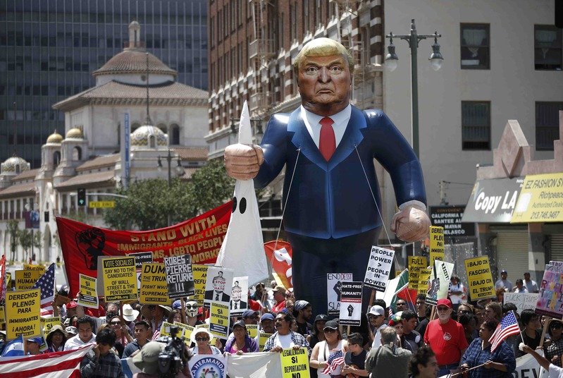 People march with an inflatable effigy of Donald Trump during an immigrant rights protest. Credit: Reuters/Files
