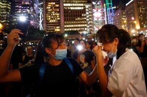 Protesters cry during a silent moment as students attend a rally to call for political reforms outside City Hall in Hong Kong, China. August 22, 2019. Photo: Reuters/Kai Pfaffenbach
