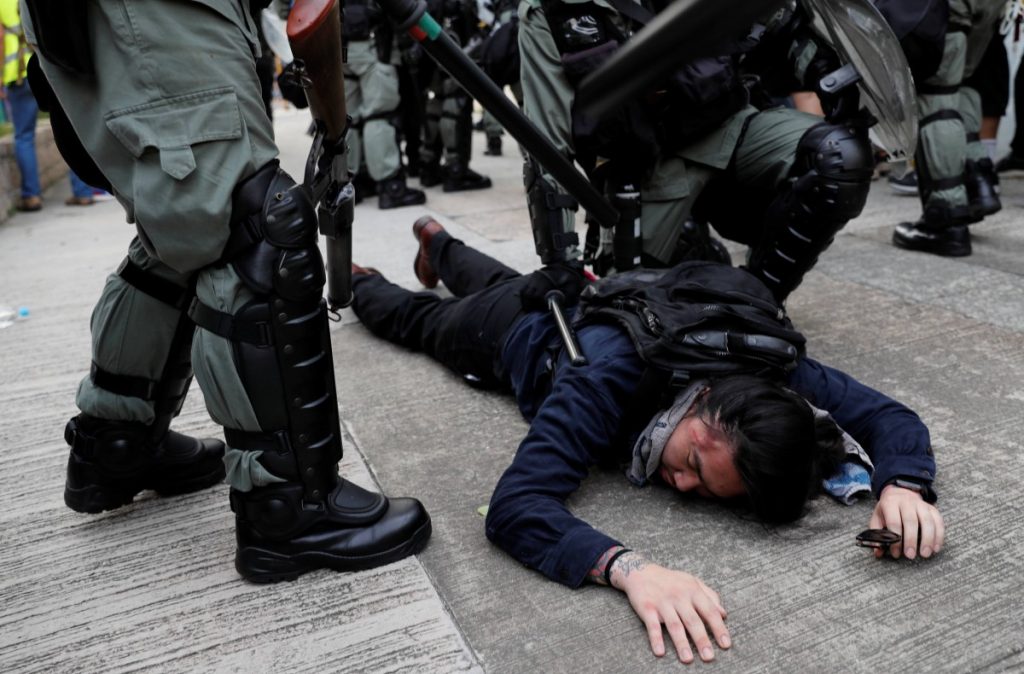 Riot police detain a demonstrator as they clash during a protest at Kowloon Bay in Hong Kong, China. August 24, 2019. Photo: Reuters/Tyrone Siu