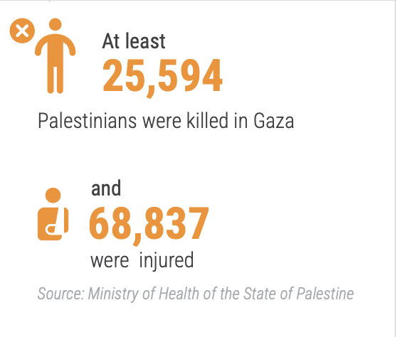 "The conduct of hostilities by Israeli military in Gaza continued to kill and maim unprecedented numbers of civilians; cause a catastrophic humanitarian crisis; displace virtually the entire population of Gaza, often multiple times; and destroy the remaining civilian infrastructure. This imposed on Palestinians conditions of life increasingly incompatible with their continued existence in Gaza as a group," the report says.