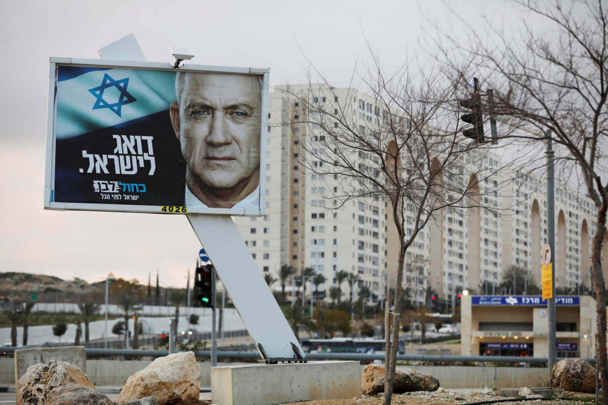A Blue and White party election campaign banner depicting leader Benny Gantz is seen in Modiin, Israel March 1, 2020. Photo: Reuters/Ronen Zvulun