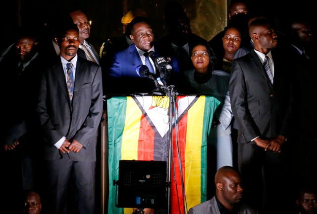 Zimbabwe's former vice president Emmerson Mnangagwa, who is due to be sworn in to replace Robert Mugabe as president, addresses supporters in Harare, Zimbabwe, November 22, 2017. Credit: Reuters/Mike Hutchings/Files