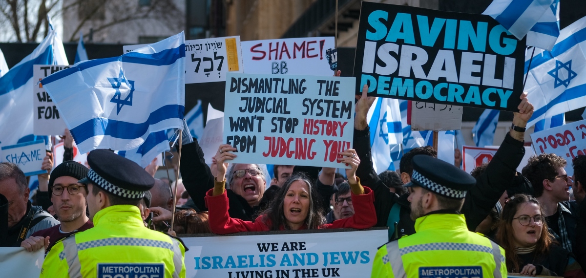 Representative image. Jews and Israelis in the UK protest against Israel President Benjamin Netanyahu's judicial overhaul. Photo: Alisdare Hickson/Flickr CC BY SA 2.0
