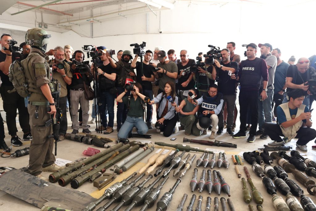 An Israeli Government Press Office (GPO) tour shows weapons and ammunition from the field used by Hamas on October 7, at the Julis Military Base on November 10, 2023. Photo: Mishel Amzaleg/GPO via +972 Magazine.