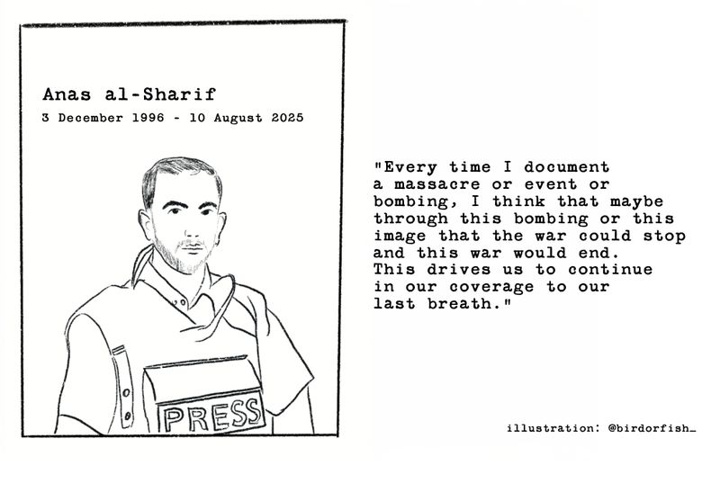 The people killed by the Israeli Defence Forces in Palestine every day are not just numbers, they were humans full of love and longing, appetites, fears and ambition. As I draw Anas al-Sharif, I think of him putting on his Press flak jacket every morning, the same jacket that turns journalists in Gaza into targets. I wonder at his courage, the sense of duty that drove him and his colleagues to report relentlessly through fire, bombings, starvation and disease. I add brushstrokes to his hair and try to imagine what it must feel like to try and appear presentable for a televised report in the midst of a genocide. I draw his eyes, his ears and think of him as a young boy dreaming of becoming a journalist one day. As I draw, I repeat Anas al-Sharif's prayer: may this image be the last. May the killings end.