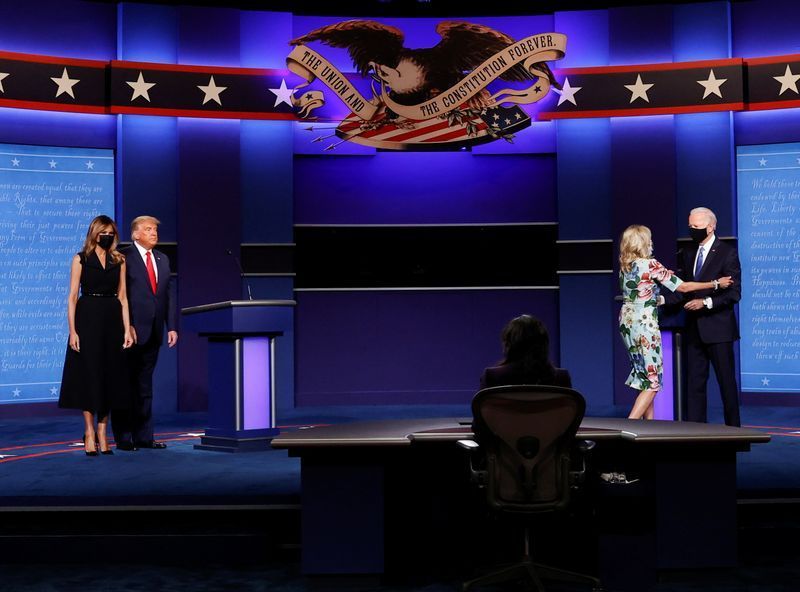 U.S. President Donald Trump and Democratic presidential nominee Joe Biden are joined on stage by first lady Melania Trump and by Dr. Jill Biden after their second 2020 presidential campaign debate at Belmont University in Nashville, Tennessee, U.S., October 22, 2020. Photo: Reuters/Mike Segar