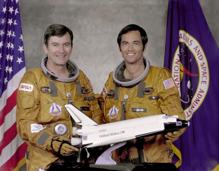 STS-1 crew members commander John Young (L) and pilot Robert Crippen pose with a model of the Space Shuttle Columbia at Johnson Space Center in Houston May, 7, 1979. Young and Crippen flew the first orbital mission of NASA's space shuttle program aboard the Columbia. Credit: NASA/Handout via Reuters/File Photo
