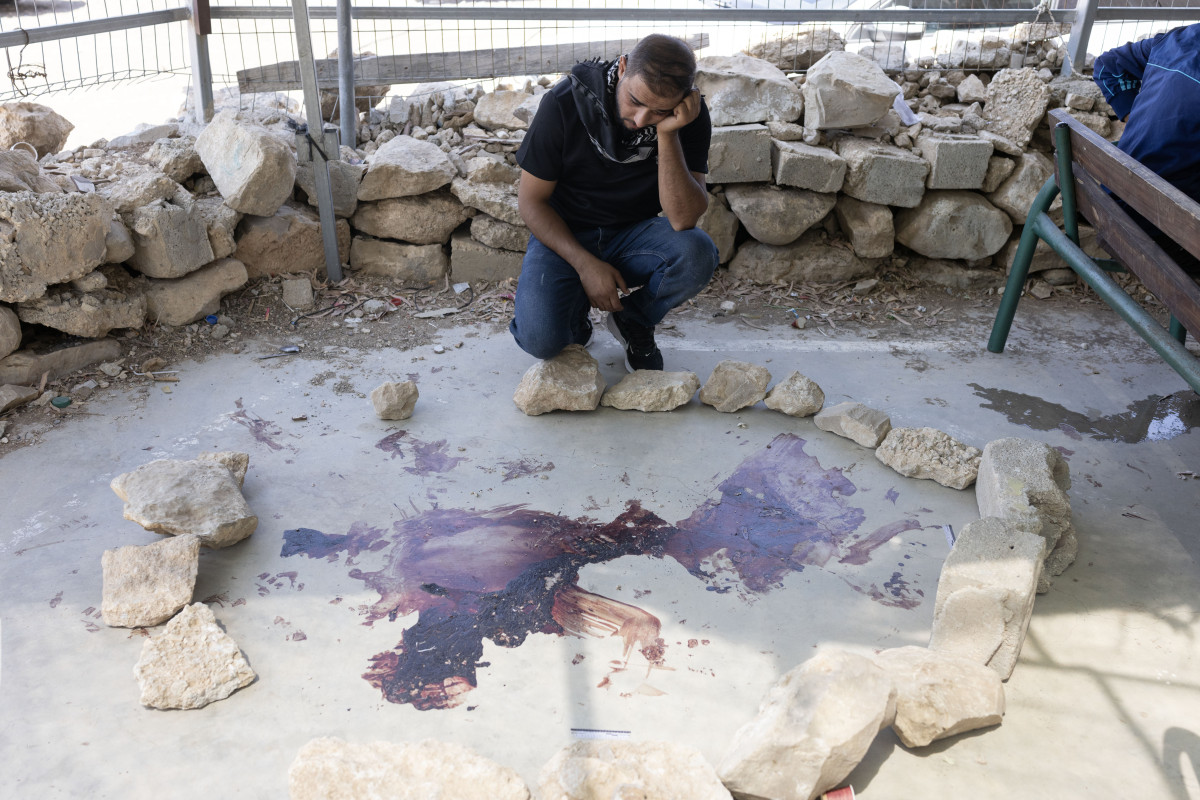 Alaa Hathaleen, Awdah's cousin, mourns at the spot where Awdah was shot by the settler Yinon Levi in Umm Al Khair, the Occupied West Bank, on July 29, 2025. Photo: Oren Ziv