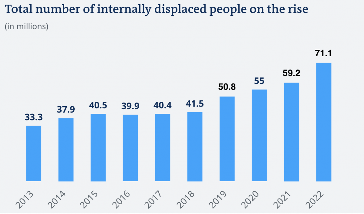 Conflicts resulted in the internal displacement of 28.3 million in 2022. The figure has nearly doubled during the year and is three times higher than the annual average over the past decade.