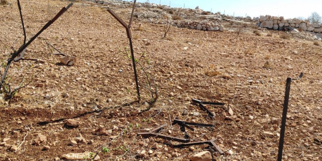 At 9:30, we get a frantic phone call from Abu Rafa’, who is out in the fields. A settler herd with two shepherds is at the edge of what was once his vineyard. (On April 2, 2019, these settlers destroyed the vineyard, cutting down the vines at their roots. The damage was immense, a loss of tens of thousands of shekels. Since then, the settlers have visited the vineyard many more times, recently uprooting the iron poles that once held the vines in place; they litter the ground, some twisted into grotesque shapes.) Abu Rafa’ says there are also settlers on the hill just above him. We race over the dirt paths – hardly more than goat trails – to join him. He is in danger. Soon we see two settler cars blocking the path, two settlers in one of them, a third standing outside, his face masked – attack mode. Neriya Ben-Pazi, the dark presence who reigns over the outposts in this area, is in the driver’s seat. After a few moments, he drives off. The masked would-be attacker describes an arc on the hill, ending up a few meters from Arik’s car. I’m expecting him to start throwing rocks at us, or worse. Arik gets out of the car and stands his ground, facing him, staring him down. After some tense minutes, the settler crosses the path and moves on.