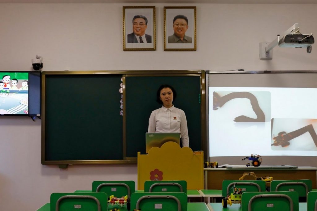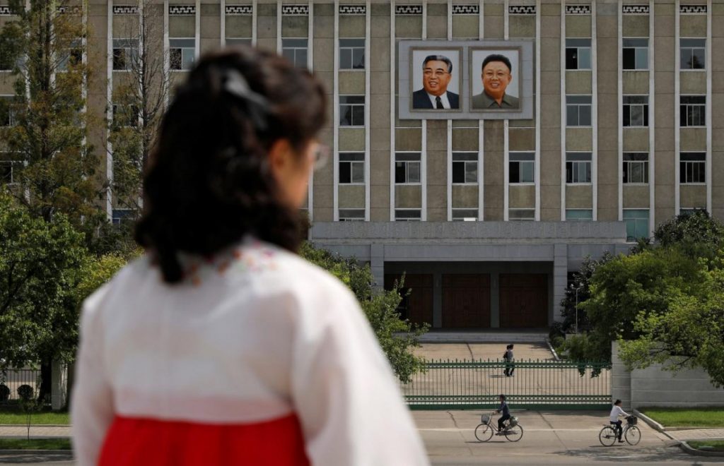 A student stands under the portraits of late North Korean leaders Kim Il Sung and Kim Jong Il. Credit: Reuters