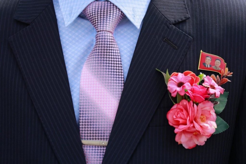 A bridegroom wears a badge with portraits of late North Korean leaders Kim Il Sung and Kim Jong Il.Credit: Reuters