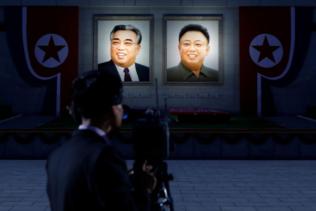 A state media cameraman films the portraits of late North Korean leaders Kim Il Sung and Kim Jong Il. Credit: Reuters
